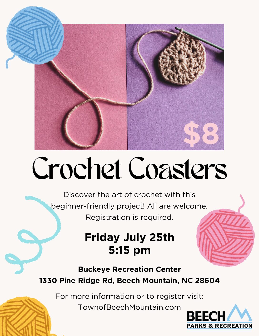 Dive into the art of crochet with this beginner-friendly class, where you’ll create your own set of fun, functional coasters! Perfect for beginners or those looking to refresh their skills, this hands-on craft night is a great way to unwind and get creative. All materials will be provided, but feel free to bring your own if you prefer. Perfect for ages 8 and up. Cost is $8, registration required. Register @ https://parksrec.egov.basgov.com/beechmountainnc